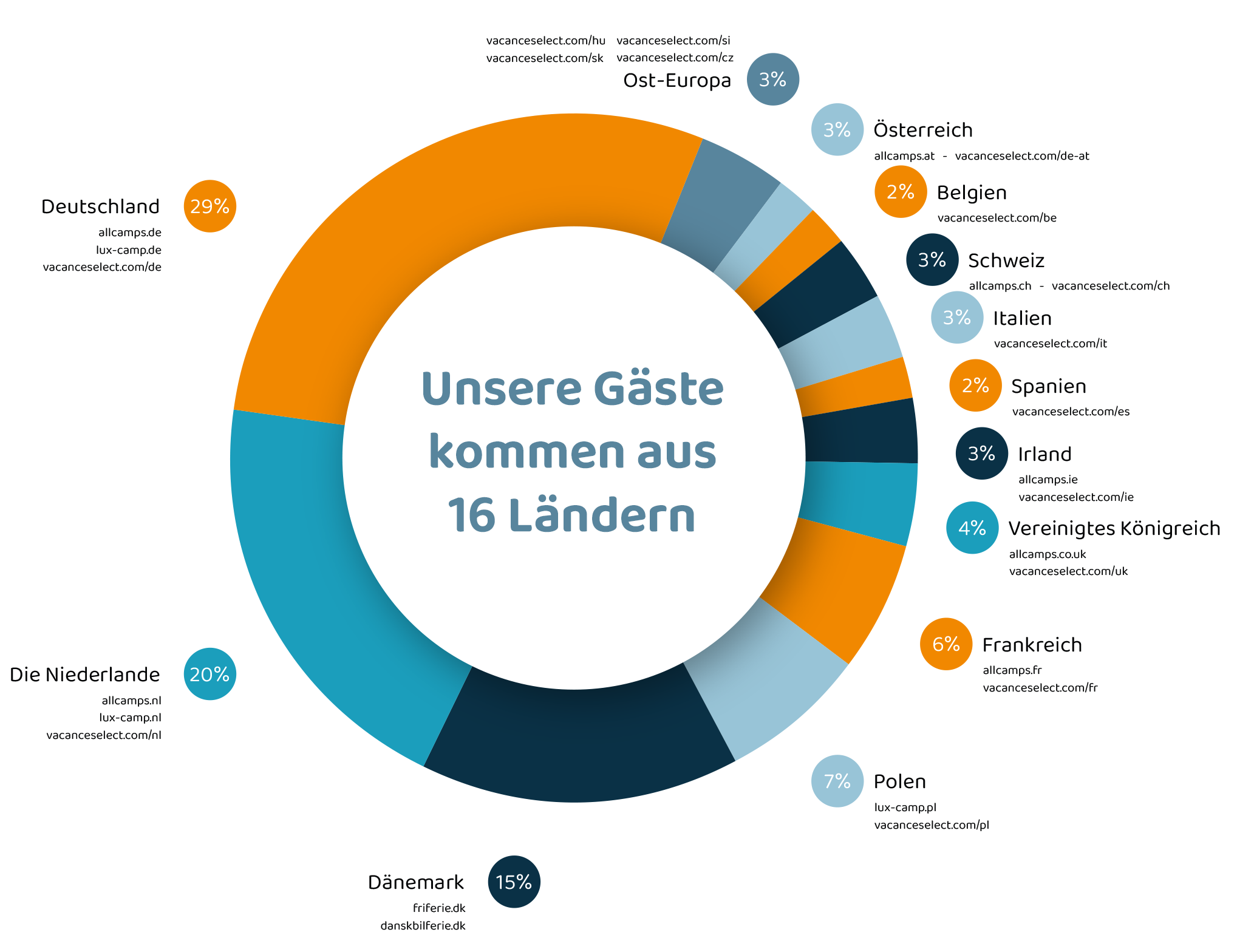 Seit über einem Vierteljahrhundert arbeiten wir mit Campingplätzen, Ferienparks und Resort Hotels in ganz Europa zusammen. Das schafft nicht nur Wissen und Vertrauen, sondern auch eine enorme Reichweite: 29 Websites in 16 Ländern, die in 12 Sprachen verfügbar sind und jährlich Millionen von Urlaubern erreichen.